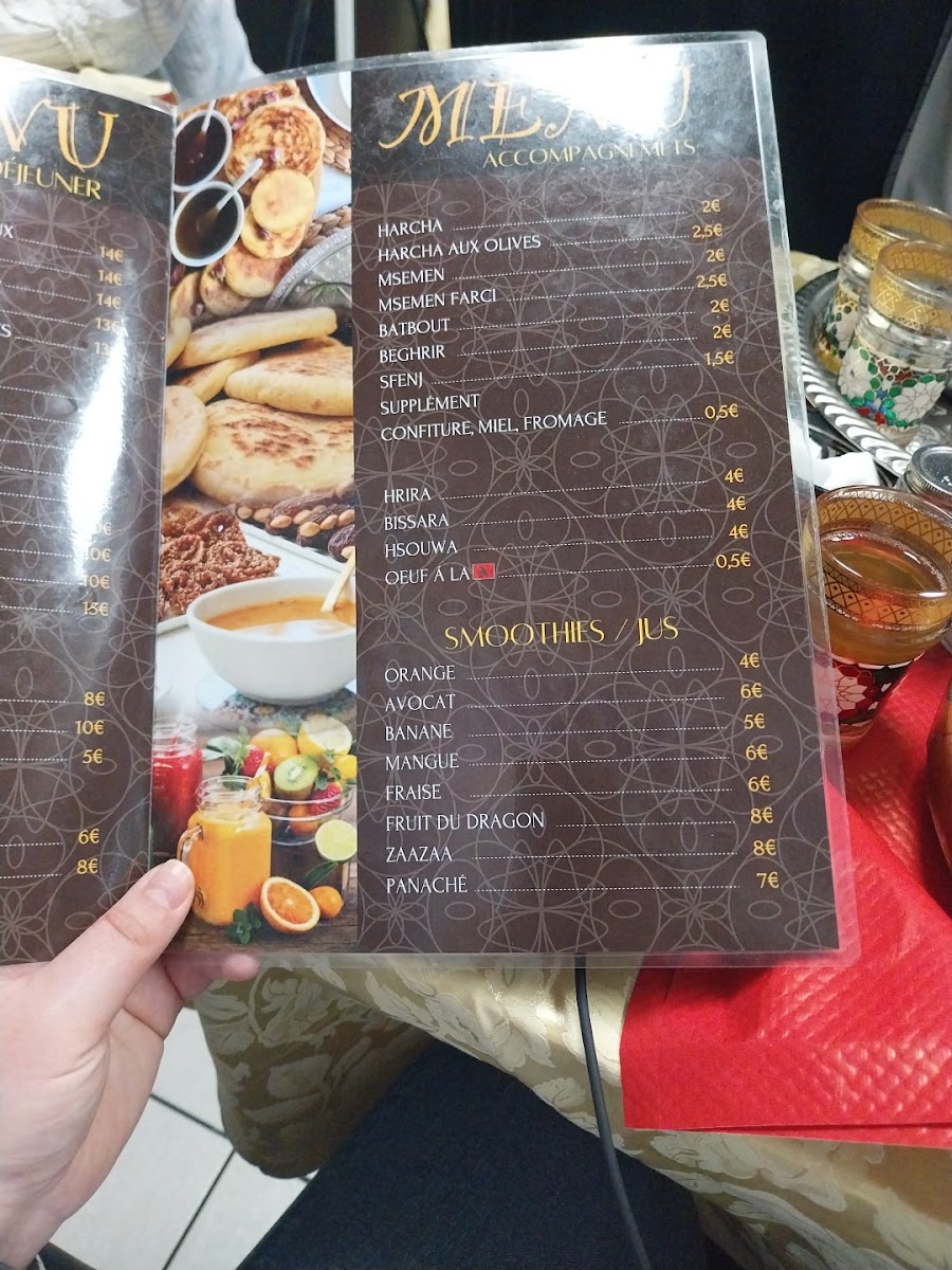 Delight in a variety of accompaniments like Harcha and Msemmen, or quench your thirst with refreshing smoothies that showcase local fruits such as Mangue and Fruit du Dragon. The menu features comforting staples, including traditional Harira soup and savory Bissara.